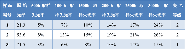 表1 荧光紫外灯老化过程中光泽变化和失光等级(60°)