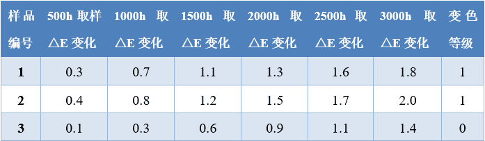表2 荧光紫外灯耐候试验色差变化和失光等级