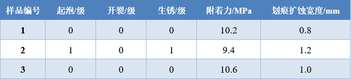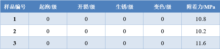 从表4中可以看出,在经冷热循环试验后,三种涂层试板均未出现起泡、开裂、生锈和变色现象,试验后付着力分别为10.8 MPa、10.2 MPa和11.6 MPa,这说明所有涂层体系都就有优异的耐冷热循环性能。在中性盐雾试验进行到1000 h后,所有涂料试板的非划痕区均未出现任何异常腐蚀现象,那么理论上来说,冷热循环试验后,同样的涂层体系也不应出现异常涂层缺陷。